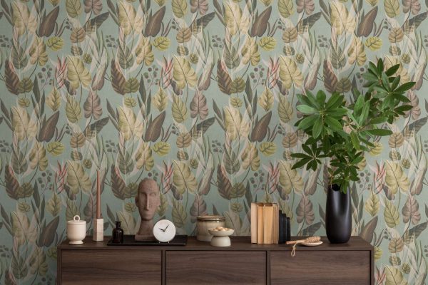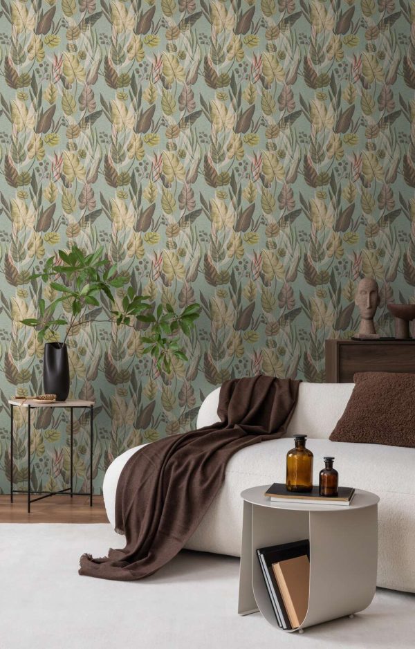 Papel pintado diseño tropical hojarasca en color verde turquesa y lila. Medidas: 10,05 m x 0,53 m. Case: 53 cm (case recto). Calidad: Tejido no Tejido. Estilo: Diseños/Tendencias. Boho Chic. Jungle Chic. Acabado: Vinílico mate.