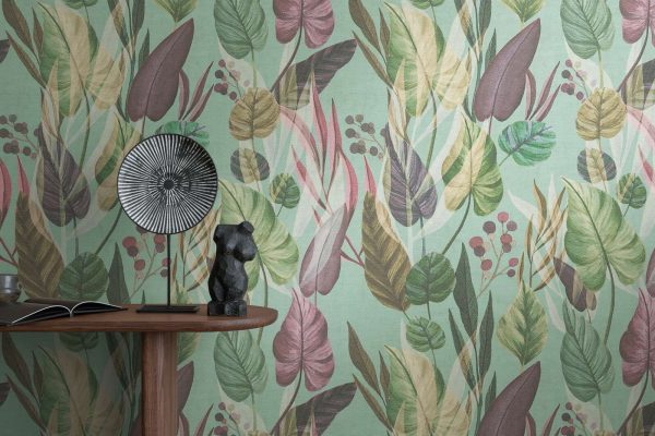 Papel pintado diseño tropical hojarasca en color verde y gris. Medidas: 10,05 m x 0,53 m. Case: 53 cm (case recto). Calidad: Tejido no Tejido. Estilo: Diseños/Tendencias. Boho Chic. Jungle Chic. Acabado: Vinílico mate.