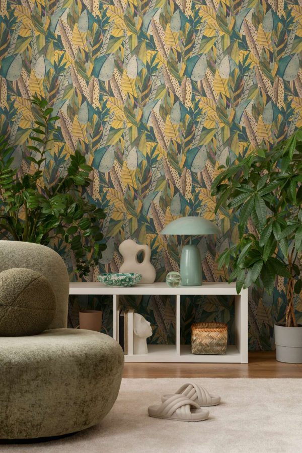 Papel pintado diseño tropical hojarasca en color verde y amarillo. Medidas: 10,05 m x 0,53 m. Case: 53 cm (case recto). Calidad: Tejido no Tejido. Estilo: Diseños/Tendencias. Boho Chic. Jungle Chic. Acabado: Vinílico mate.
