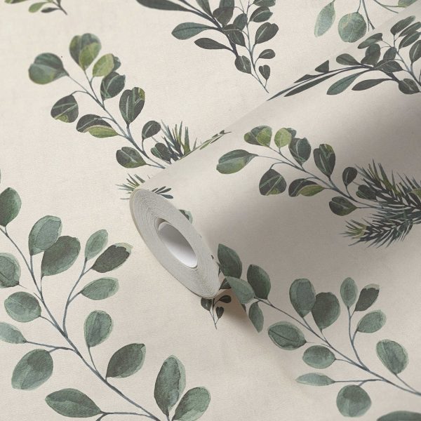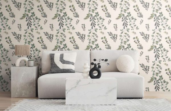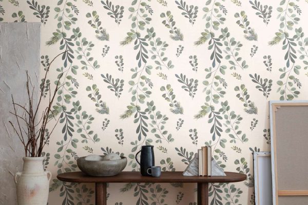 Papel pintado estilo floral moderno diseño ramillete hojas en color gris sobre fondo crema. Medidas: 10,05 m x 0,53 m. Case: 53 cm (case recto). Calidad: Tejido no Tejido. Estilo: Romantic Chic. Diseños/Tendencias. Acabado: Vinílico mate.