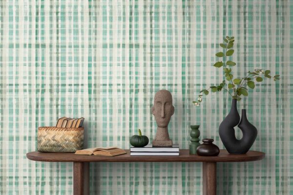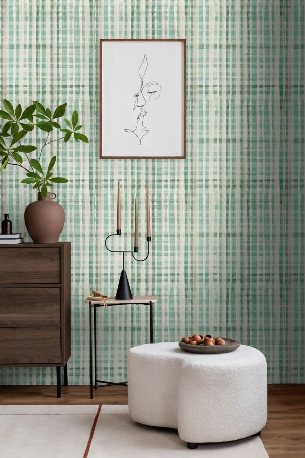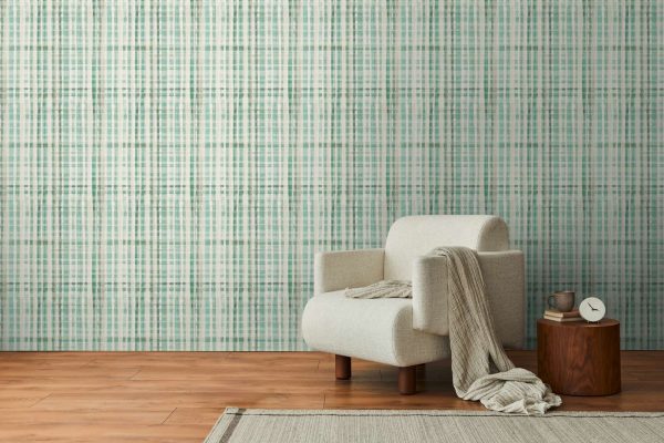 Papel pintado geométrico de cuadros estilo abstracto en colores verde, turquesa y crema.