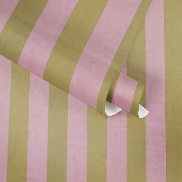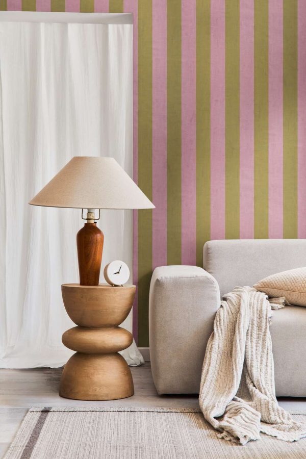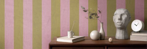 Papel pintado diseño rayas (6 cm de ancho) en color rosa y verde caqui. Medidas: 10,05 m x 0,53 m. Case: sin case. Calidad: Tejido no Tejido. Estilo: Diseños/Tendencias. Geométrico. Infantil/Juvenil. Retro Chic. Acabado: Vinílico mate.