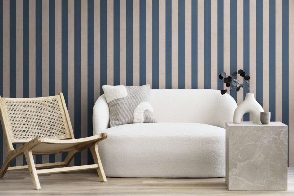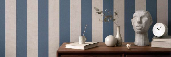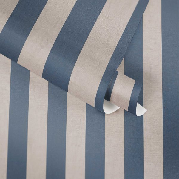 Papel pintado diseño rayas (6 cm de ancho) en color azul marino y gris. Medidas: 10,05 m x 0,53 m. Case: sin case. Calidad: Tejido no Tejido. Estilo: Diseños/Tendencias. Geométrico. Infantil/Juvenil. Acabado: Vinílico mate.