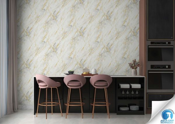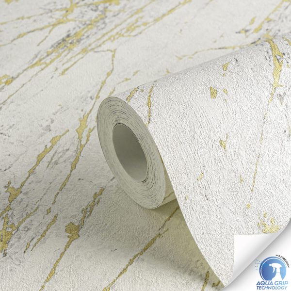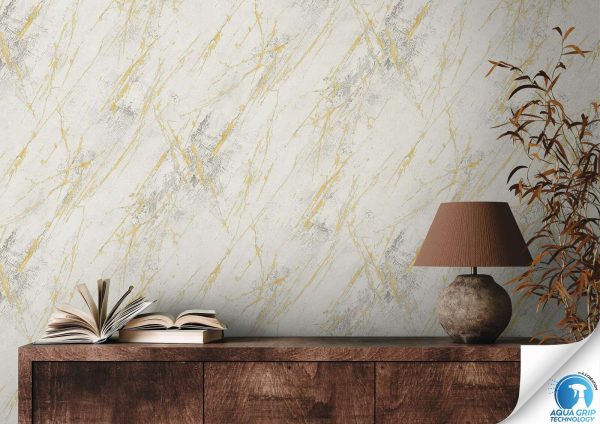 Estilo: Papel pintado ladrillo efecto mármol en crema con la veta dorada. Acabado vinílico.