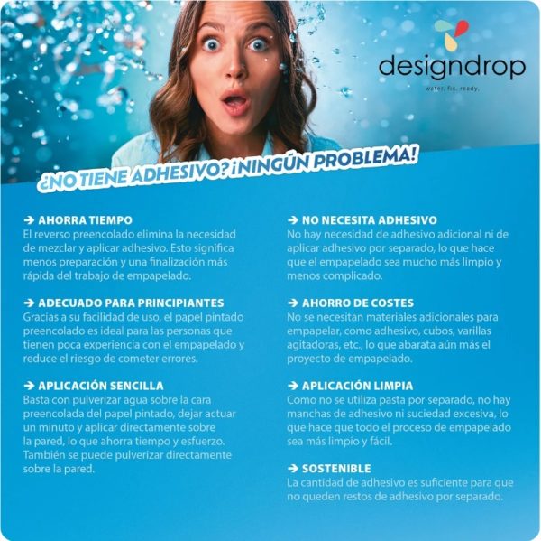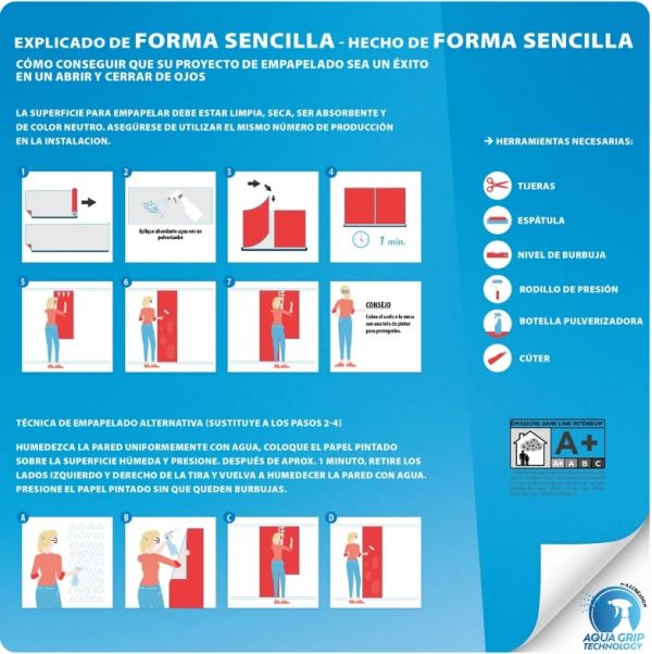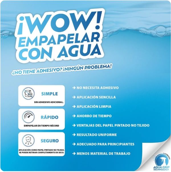 Calidad: Tejido no tejido. Pre-encolado. Aplicar agua directamente en la pared o al reverso del papel para activar el adhesivo.