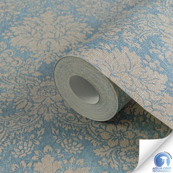Estilo: Papel pintado de ornamento barroco en color crema sobre fondo azul. Acabado vinílico.