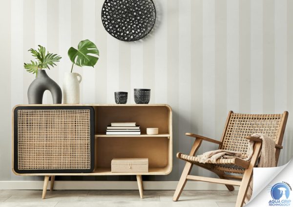Estilo: Papel pintado de rayas (13cm) en color blanco y beige. Acabado vinílico.