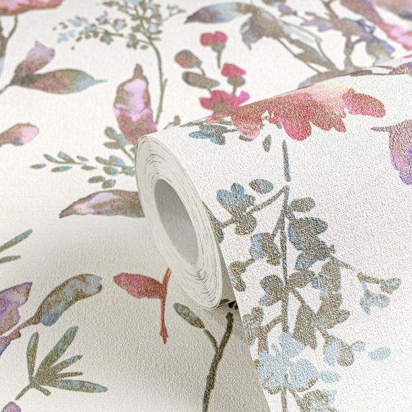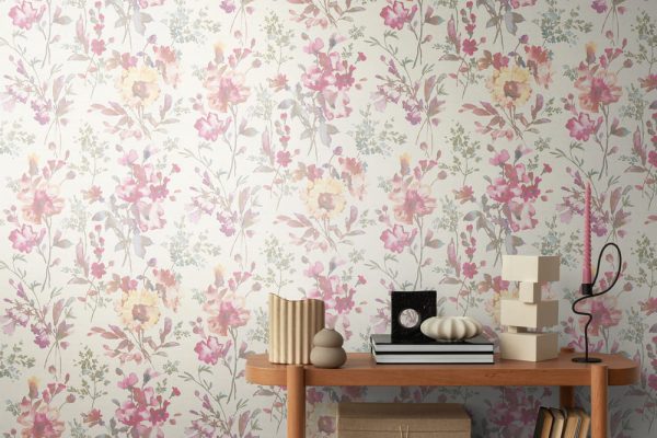 Medidas: 10,05 m x 0,53 m. Case: 64 / 32 cm (offset match). Calidad: Tejido no tejido. Estilo: Papel pintado vintage efecto acuarela con motivos florales de color pastel y fondo blanco con detalles metalizados. Acabado vinílico de alta resistencia.