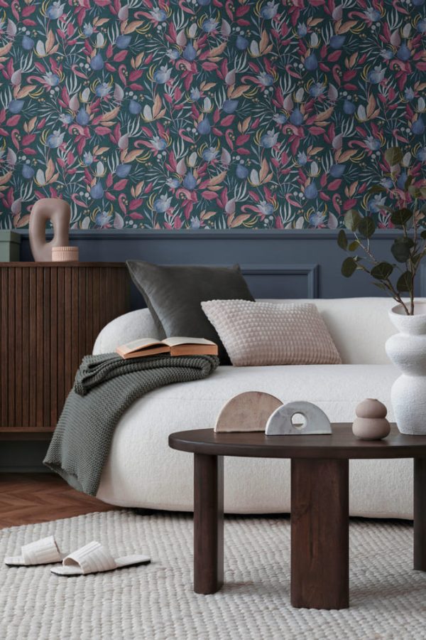 Medidas: 10,05 m x 0,53 m. Case: 64 / 32 cm (offset match). Calidad: Tejido no tejido. Estilo: Papel pintado vintage efecto acuarela con motivos florales en colores pastel rojo y azul con fondo gris. Acabado vinílico de alta resistencia.