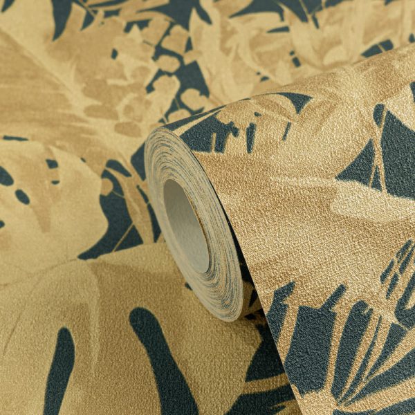 Medidas: 10,05 m x 0,53 m. Case: 53 cm (case recto). Calidad: Tejido no tejido. Estilo: Papel pintado estilo vintage con motivos de palmeras en color marrón dorado y fondo verde. Efecto metálico. Acabado vinílico de alta resistencia.