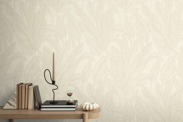Medidas: 10,05 m x 0,53 m. Case: 64 cm (case recto). Calidad: Tejido no tejido. Estilo: Papel pintado estilo vintage con motivos de hojarasca en color gris y fondo crema con detalles metalizados. Acabado de textura ligera.
