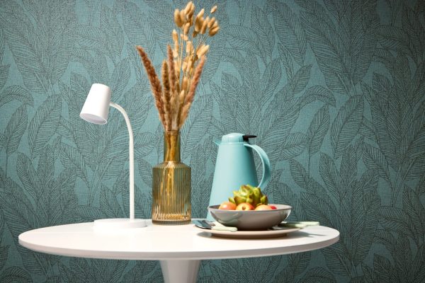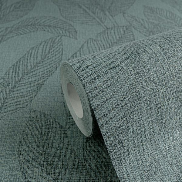 Medidas: 10,05 m x 0,53 m. Case: 64 cm (case recto). Calidad: Tejido no tejido. Estilo: Papel pintado estilo vintage con motivos de hojarasca en color verde turquesa con efecto metalizado. Acabado de textura ligera.