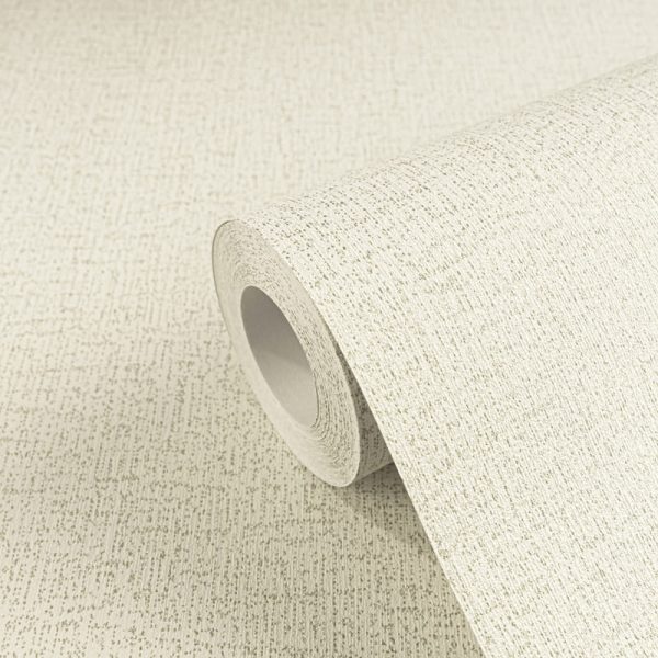 Medidas: 10,05 m x 0,53 m. Case: sin case. Calidad: Tejido no tejido. Estilo: Papel pintado liso de textura ligera en color blanco-crema con un sutil efecto metálico.