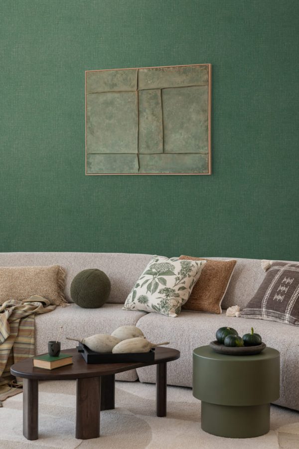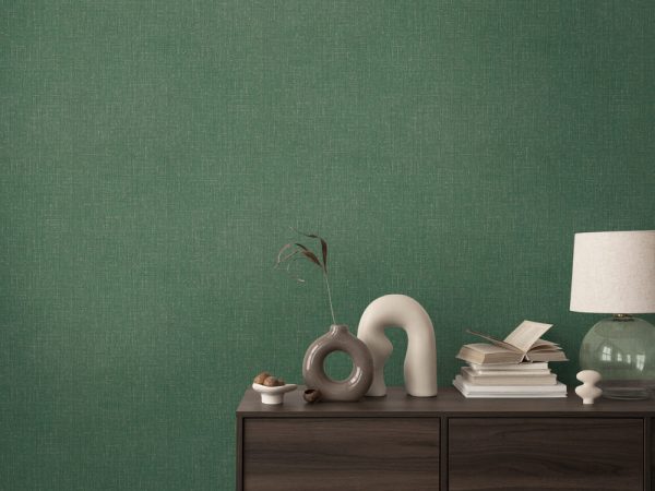 Medidas: 10,05 m x 0,53 m. Case: sin case. Calidad: Tejido no tejido. Estilo: Papel pintado liso de textura ligera en color verde jade con sutiles detalles dorados.