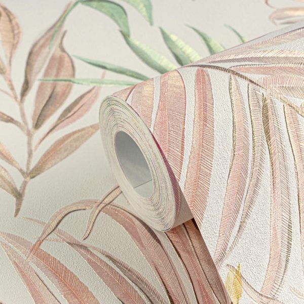 Estilo: Papel pintado vintage de estilo tropical de hojas de palmera en colores pastel verde-rosa sobre fondo beige. Acabado vinílico brillante de alta resistencia.