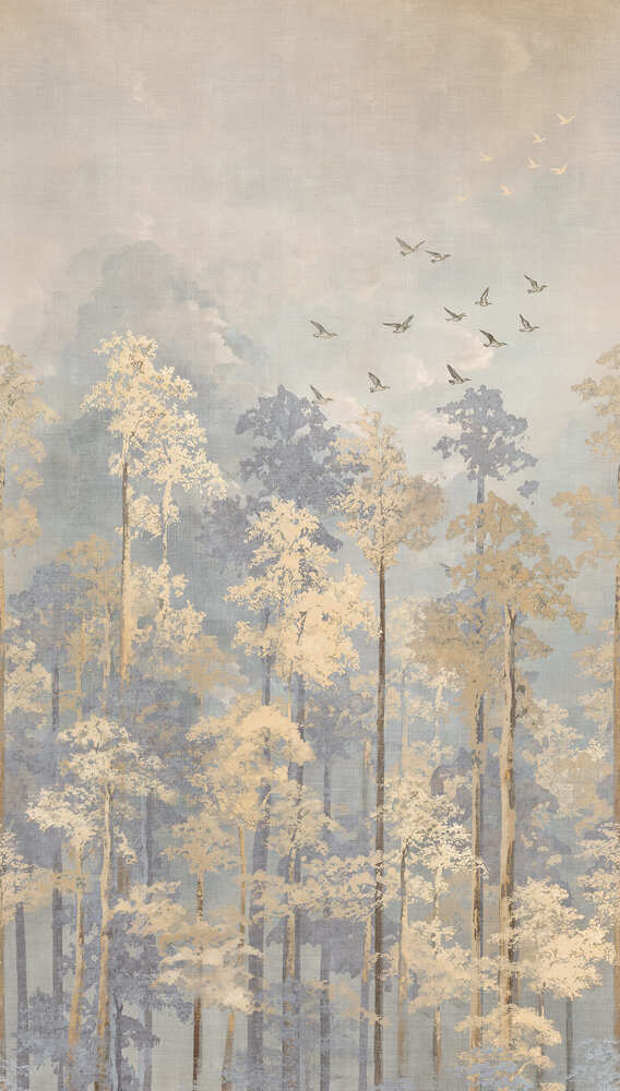 Mural digital diseño arboleda de estilo acuarela en color dorado sobre fondo degradado en gris y azul. Patrón permite repetición.