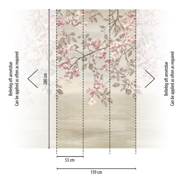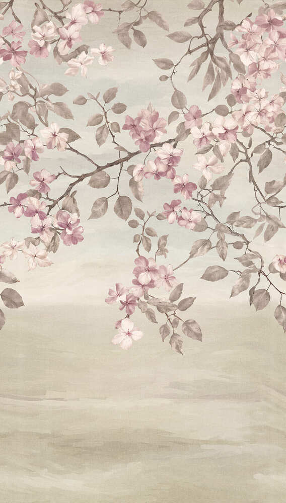 Mural digital diseño floral de ramas de flor de cerezo en color rosa pastel sobre fondo crema. Patrón permite repetición.