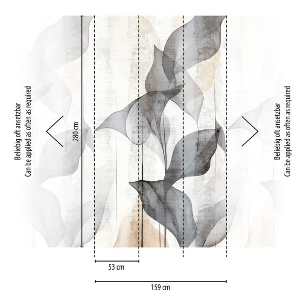 Mural digital diseño floral de hojas efecto translúcido pintado en acuarela en color gris, blanco y negro. Patrón permite repetición.