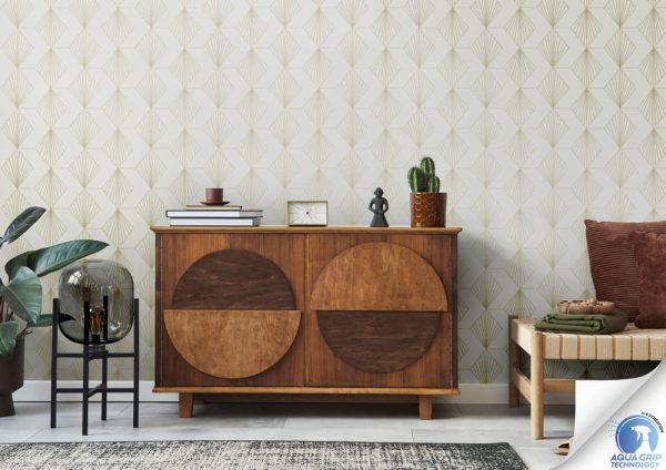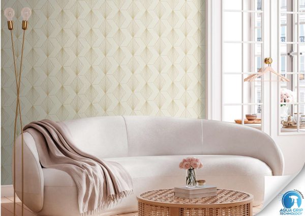 Estilo: Papel pintado geométrico estilo Art-Decò dorado con fondo crema. Acabado vinílico.