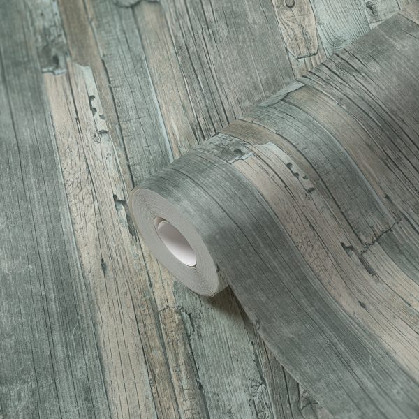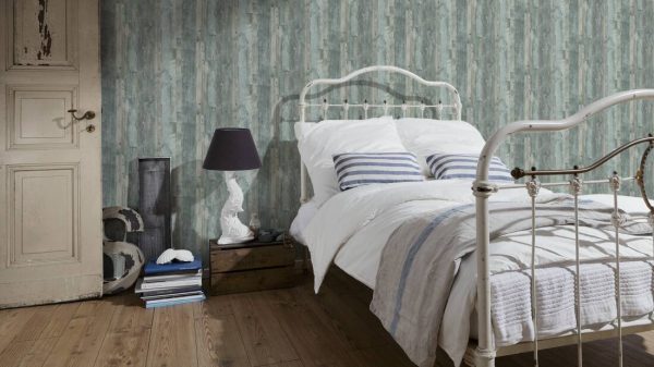 Medidas: 10,05 m x 0,53 m. Case: 64 / 32 cm (offset match). Calidad: Tejido no tejido. Estilo: Papel pintado efecto madera náutica con efecto decapado en color azul y verde turquesa.