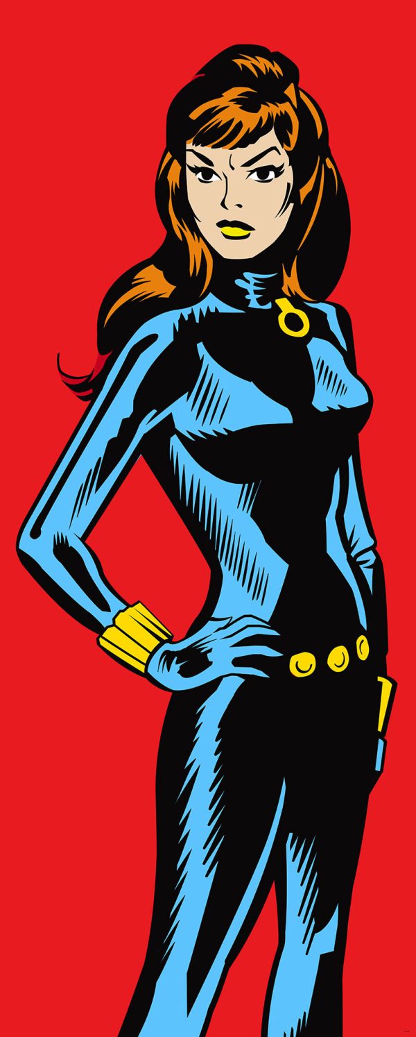 Mural juvenil de impresión digital de la viuda negra de Marvel estilo cómic. No inlcuye cola. Medidas: 100*250 cm. Presentación: 2 paneles. Calidad: Tejido no tejido.