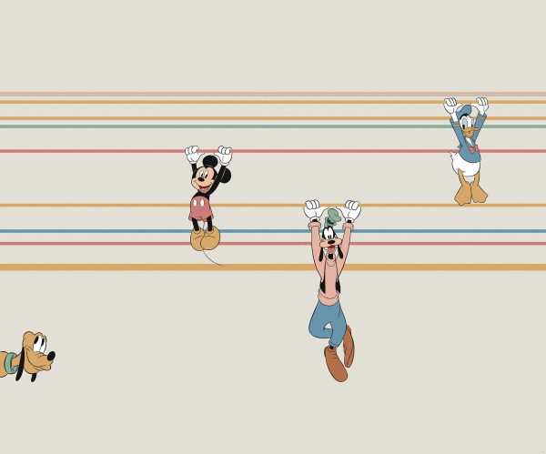Mural infantil de impresión digital de Mickey y sus amigos colgando de cuerdas de arcoiris «Mickey Hanging with Friends». No incluye cola. Medidas: 300*250 cm. Presentación: 6 paneles. Calidad: tejido no tejido.