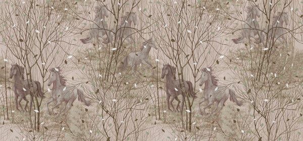 Mural juvenil de impresión digital de caballos galopando en un bosque estilo acuarela «Free Spirit». No incluye cola.Medidas: 600*280 cm. Presentación: 12 paneles. Calidad: tejido no tejido.