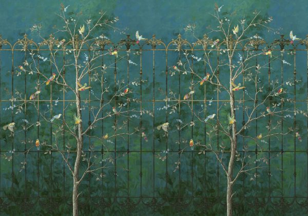 Mural juvenil de impresión digital de árboles delante de una verja con pajaritos revoloteando en un fondo turquesa «Park Avenue». No incluye colaMedidas: 400*250 cm. Presentación: 8 paneles. Calidad: tejido no tejido.