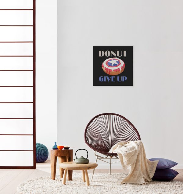Cuadro de Capitan America de Marvel «Donut give up». Medidas: 30*30 cm.. Presentación: Lienzo impresión digital en marco de madera. Calidad: tejido no tejido.